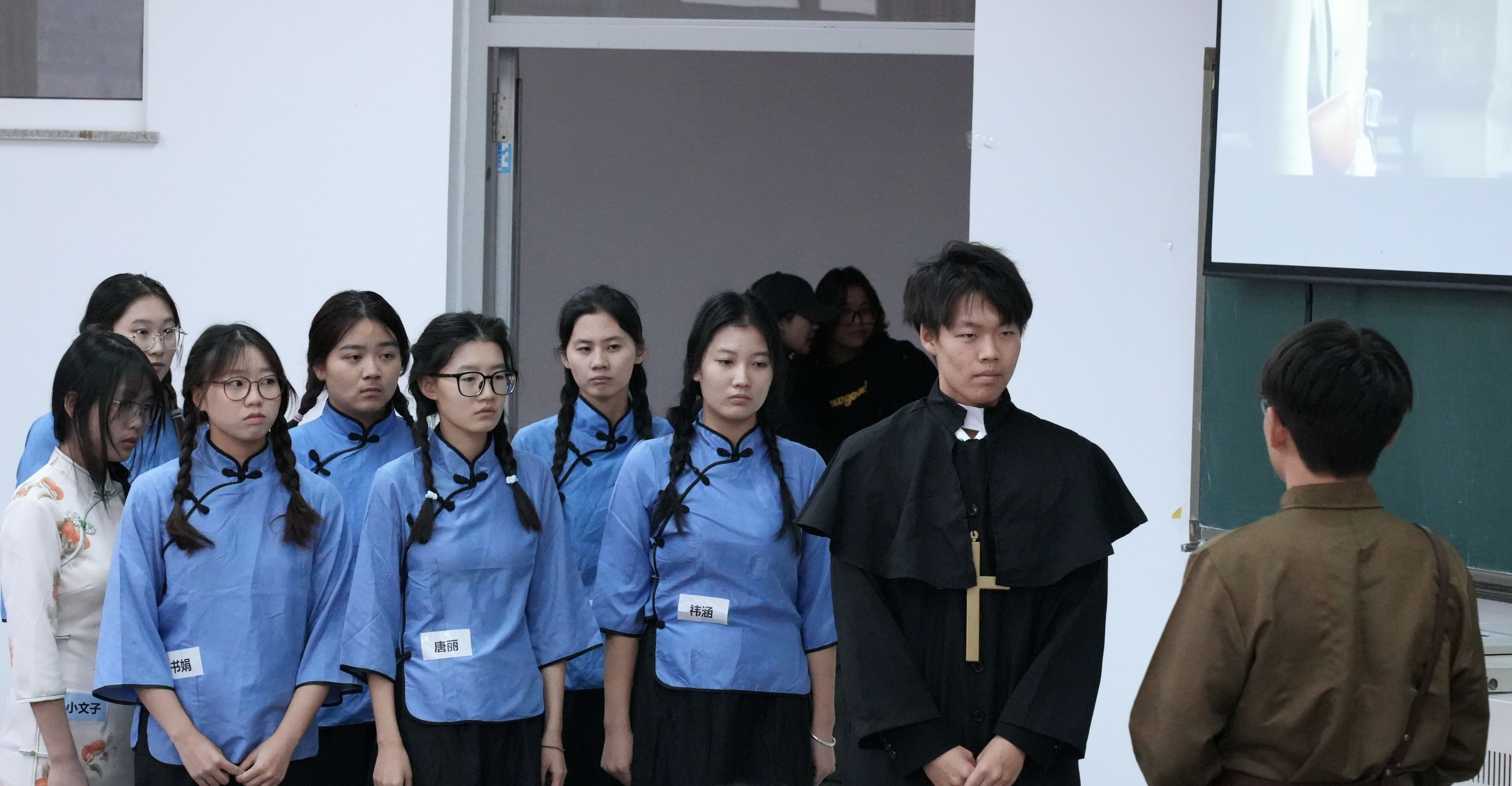 2024级8班同样演绎了《金陵十三钗》。他们以全新视角打开这段历史,在生死抉择的漩涡中,国人的命运紧紧交织。他们在废墟之上谱写一曲震撼灵魂的悲歌,让在场老师和同学们深刻体会到了那一段刻骨铭心的传奇。