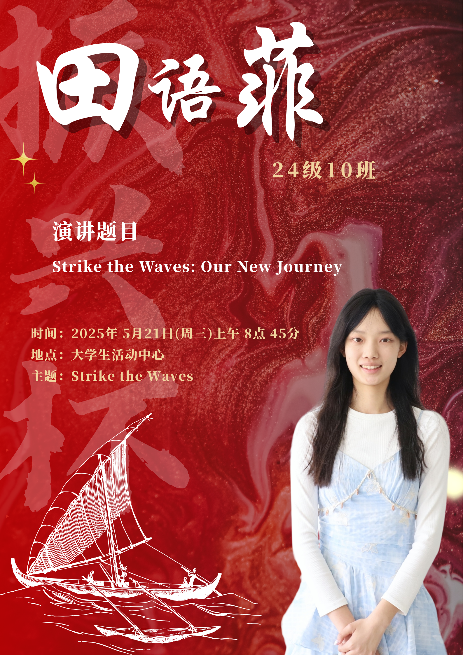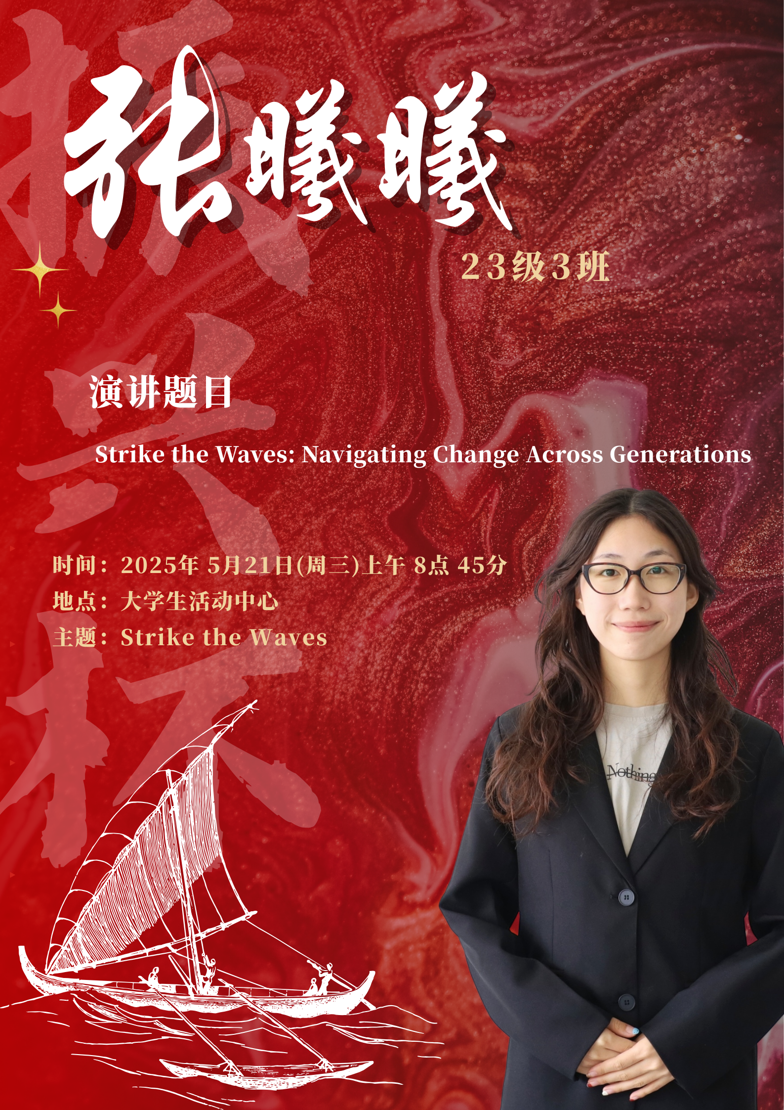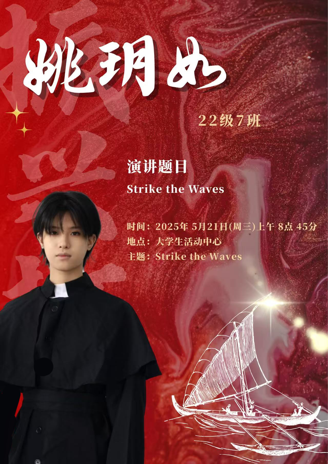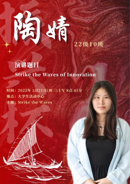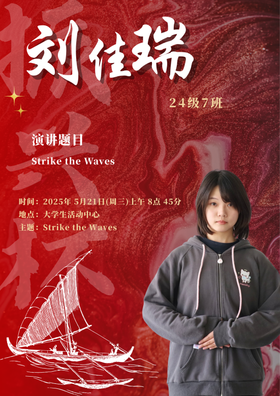 水,是生命之源,也是力量与变革的象征。在全球化的浪潮下,世界风云变幻,机遇与挑战并存,既要求我们敏锐捕捉机遇之帆,同时也要稳健掌舵抵御惊涛骇浪。同学们将登上舞台,以“击水中流,破浪前行”为主题,用英语讲述自己对时代精神的独特理解。