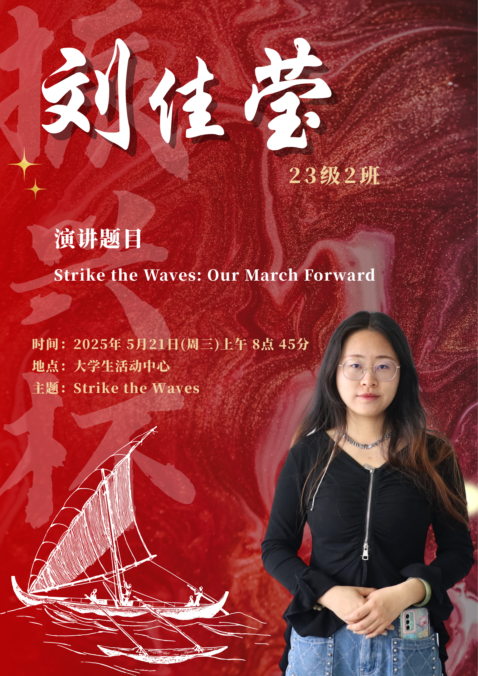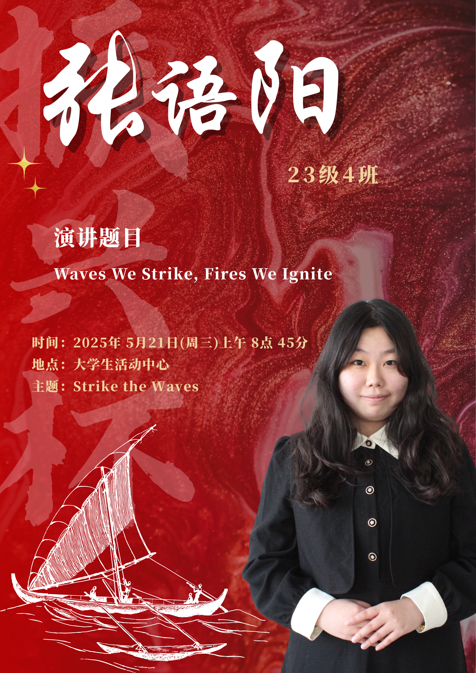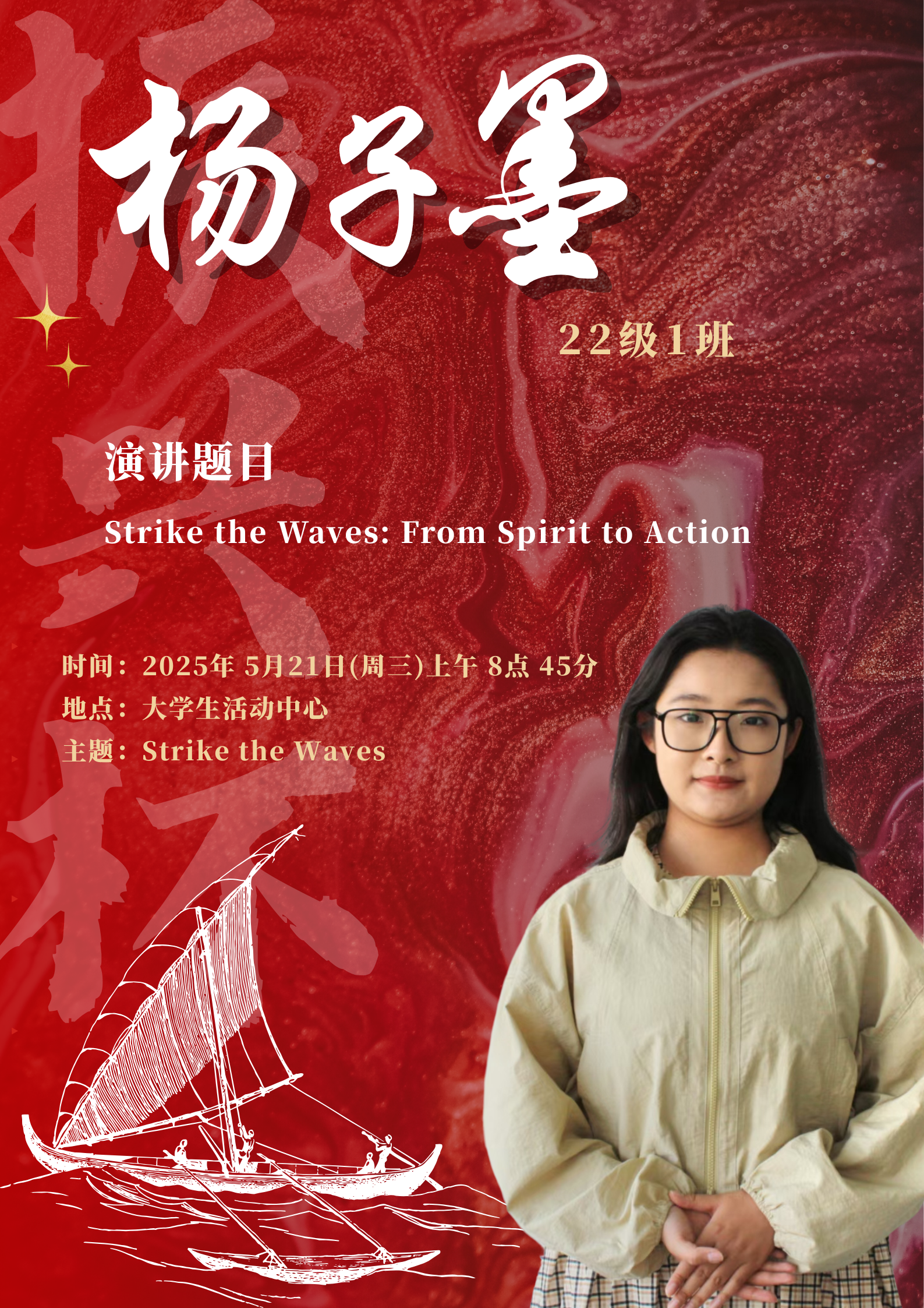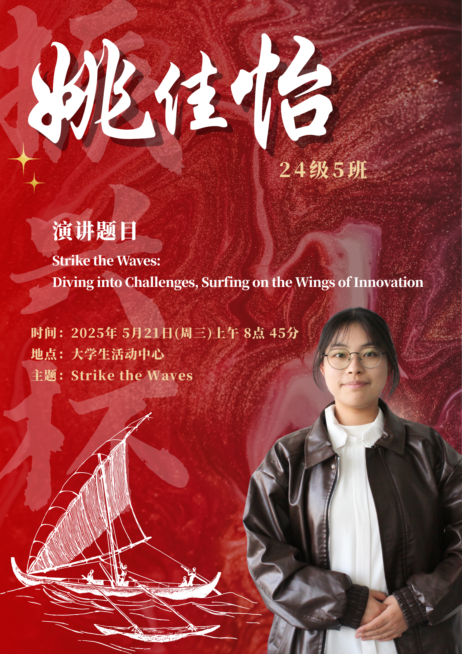 水,是生命之源,也是力量与变革的象征。在全球化的浪潮下,世界风云变幻,机遇与挑战并存,既要求我们敏锐捕捉机遇之帆,同时也要稳健掌舵抵御惊涛骇浪。同学们将登上舞台,以“击水中流,破浪前行”为主题,用英语讲述自己对时代精神的独特理解。