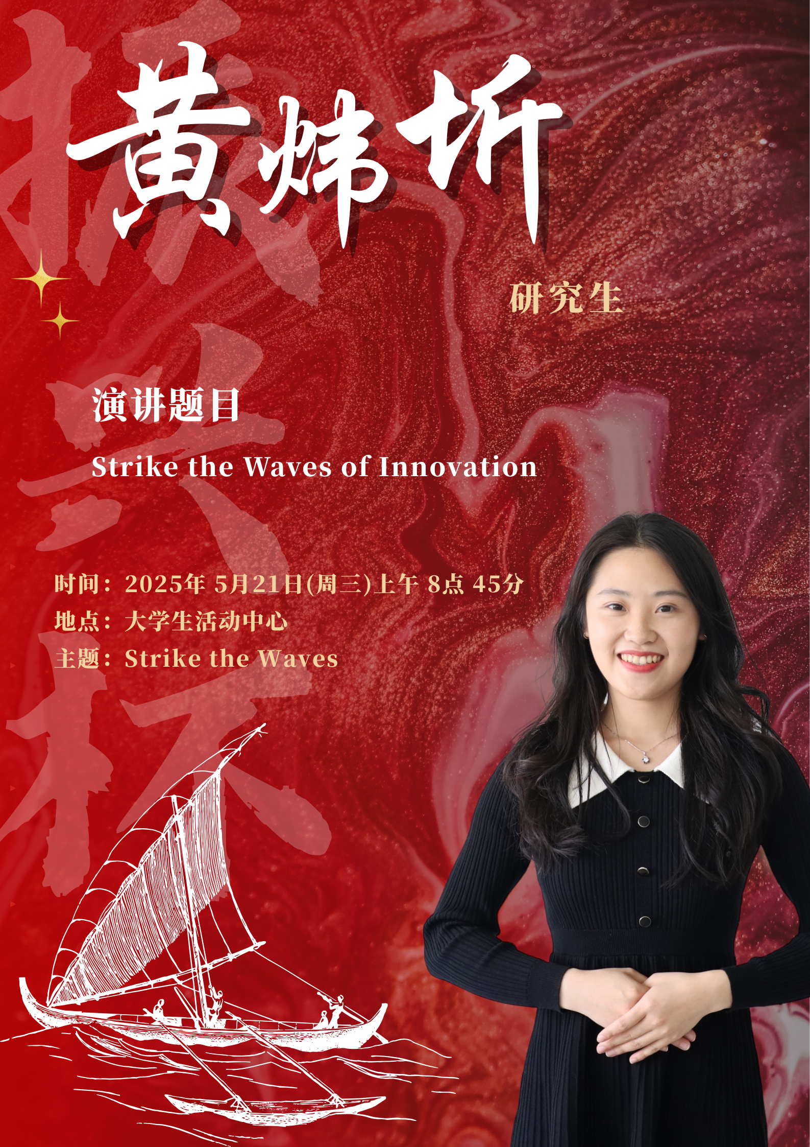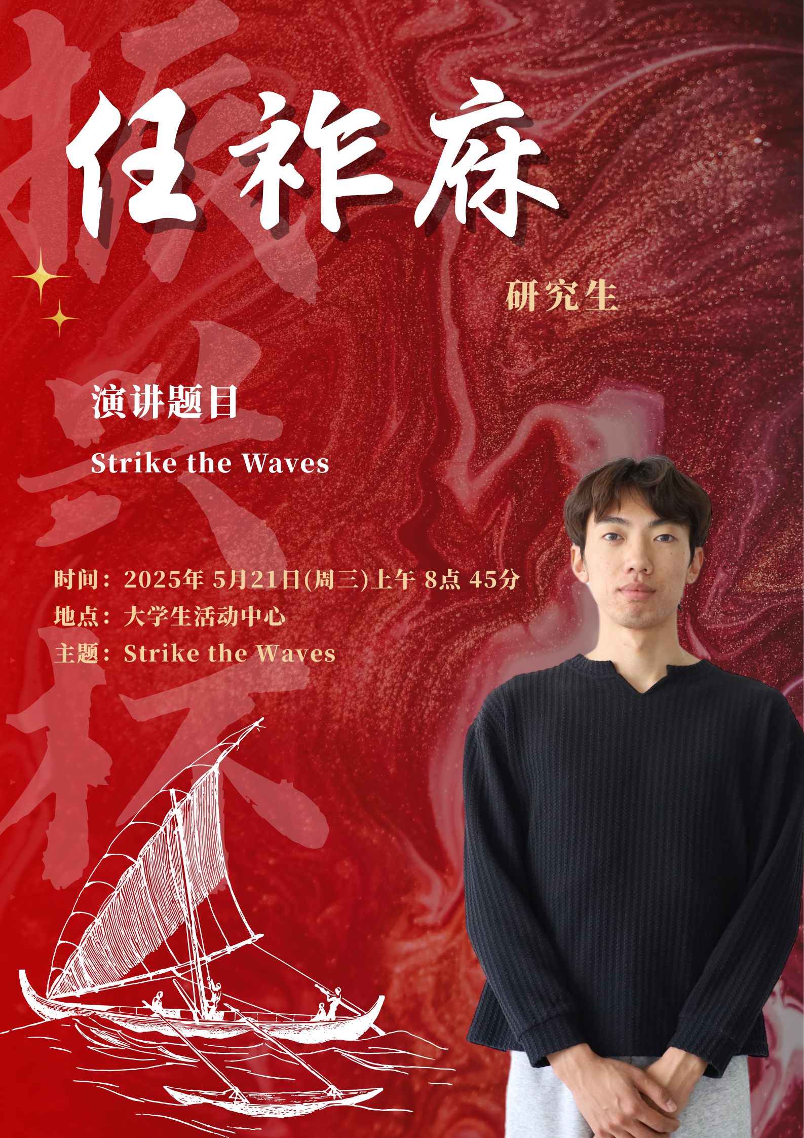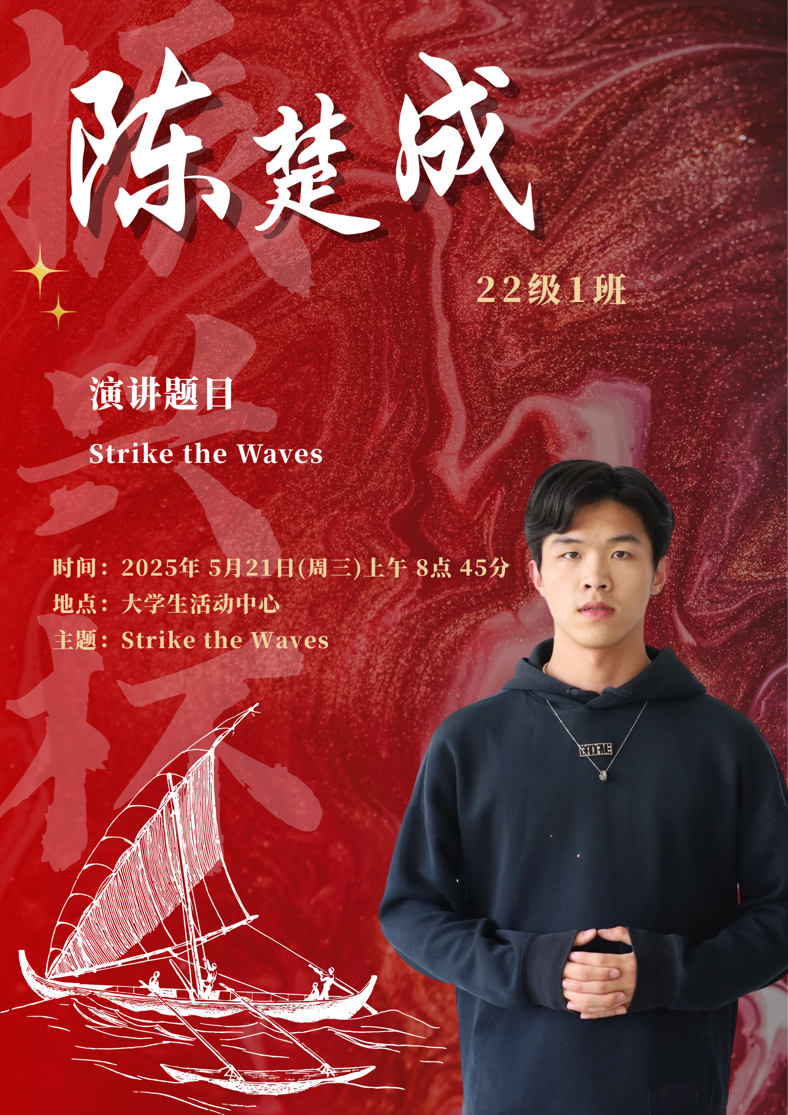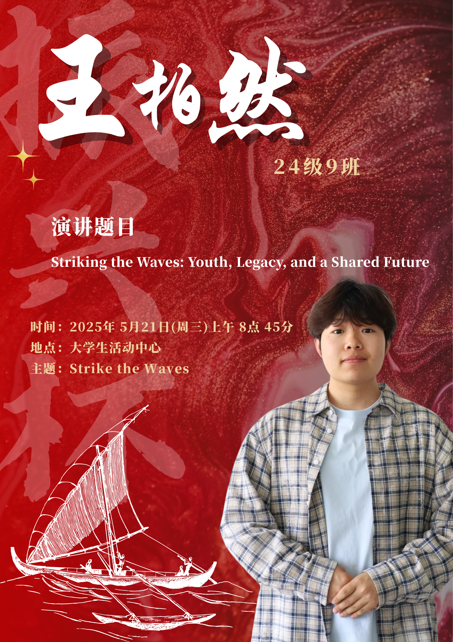 水,是生命之源,也是力量与变革的象征。在全球化的浪潮下,世界风云变幻,机遇与挑战并存,既要求我们敏锐捕捉机遇之帆,同时也要稳健掌舵抵御惊涛骇浪。同学们将登上舞台,以“击水中流,破浪前行”为主题,用英语讲述自己对时代精神的独特理解。