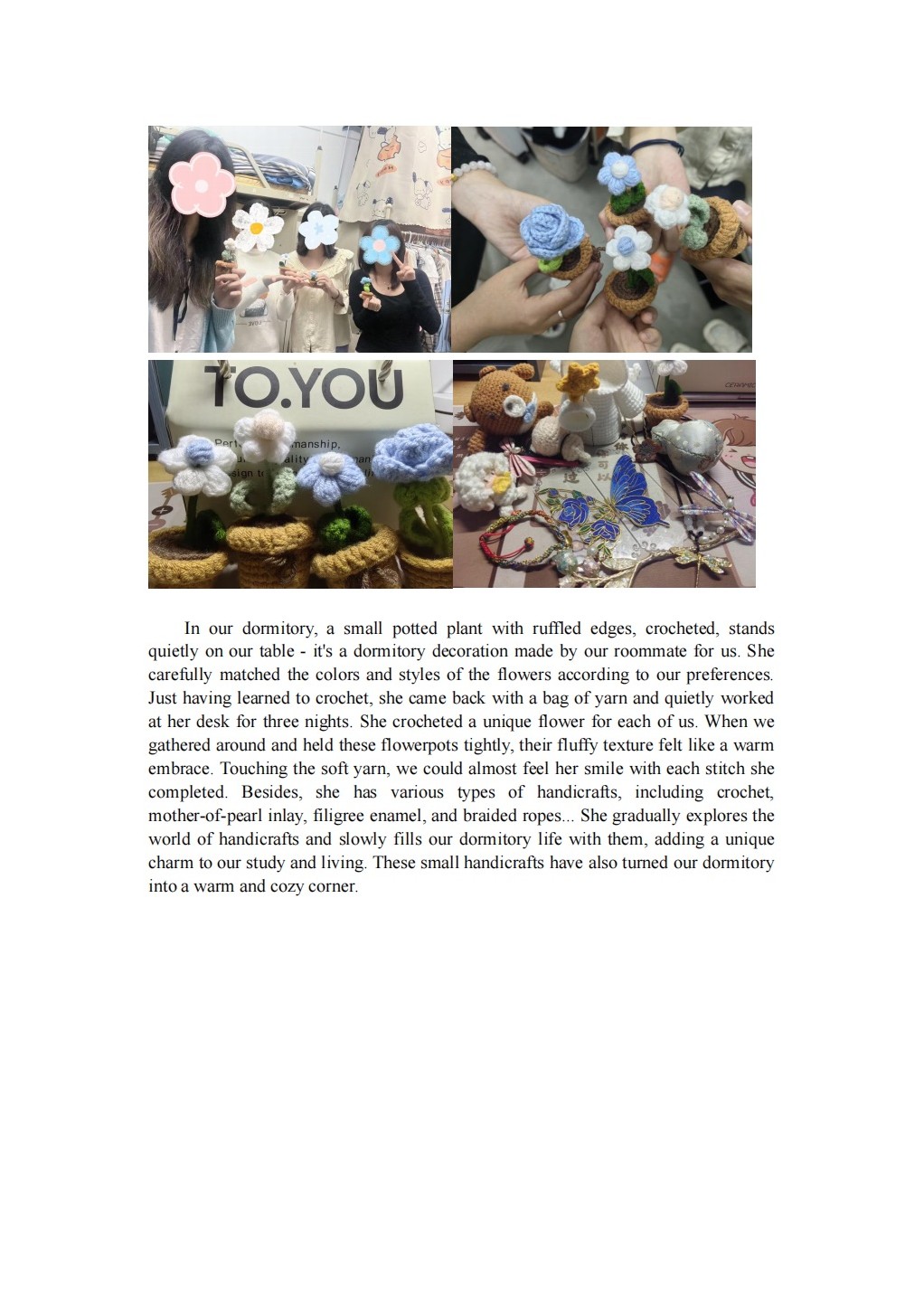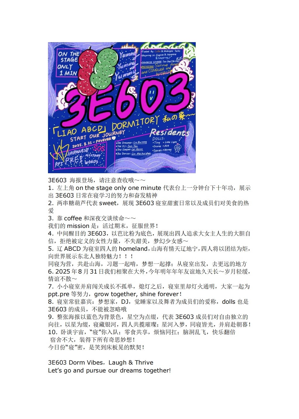 本次活动不仅丰富了同学们的课余生活,更增强了寝室凝聚力,为大学生活留下了一段温暖而精彩的回忆。希望在未来,这份用英语讲述寝室故事、用创意装点共同家园的热情能够延续,让每一间寝室都成为文化交流的微缩窗口,让“E”路同行的陪伴,成为每位英院学子大学生活中最温暖的注脚。