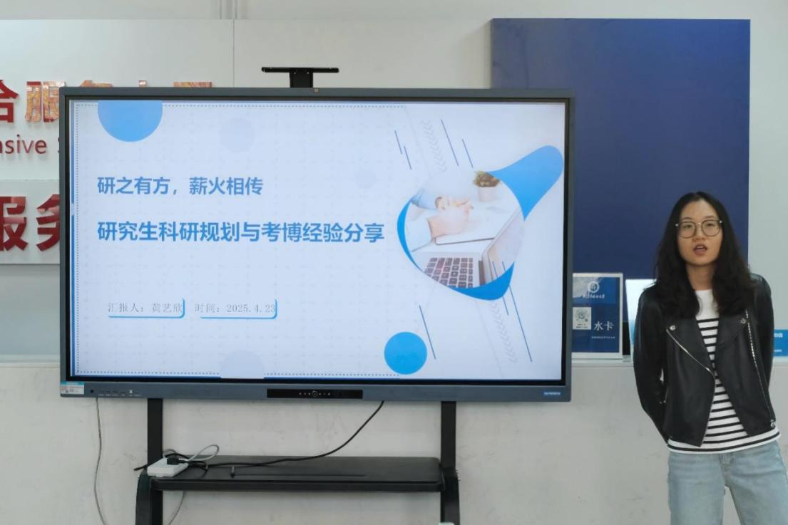 中国东北亚语言研究中心党支部代表黄艺欣做了 “研之有方,薪火相传:研究生科研规划与考博经验分享”的报告。她从研究生科研规划、论文撰写、考博心得等多个方面进行了全面而深入的分享。她也毫无保留地分享了自己的考博经验,回答了研究生党员关切的问题,让大家对科研和就业规划有了更清晰的认识。