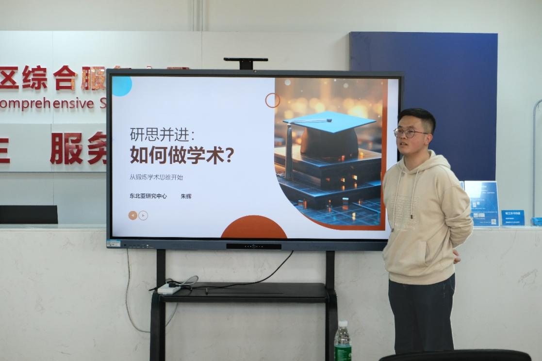 研究生处党支部代表朱辉同学做了以 “研思并进:如何做学术?” 为主题的报告。他从学术研究的方法、思路、创新点等方面进行了详细阐述。他认为,哲学思维、逻辑思维和抽象思维是学术研究的关键,建议大家研读哲学史、在学习中思考,在思考中领悟,为研究生党员的科研困惑提供了切实可行的解决方案。