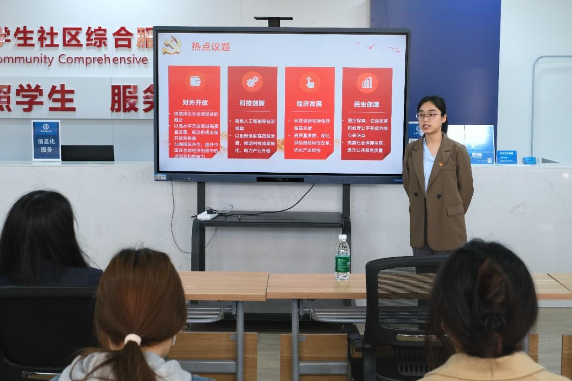 随后,研究生功能型支部代表汪诗瑶同学做了关于两会精神学习的报告 ——“聚焦高等教育相关议题总结与分析”。她结合热点议题的聚焦分析,从科研方向,职业选择和党员责任三个方面进行了分享。她提出青年党员应发挥先锋模范作用,持续学习与创新,将个人发展融入国家大局,发挥社会服务者的作用。