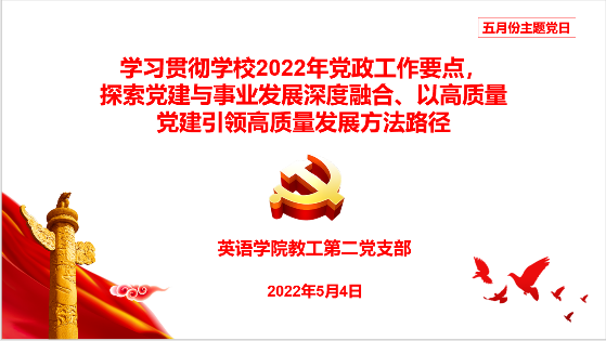 教工第二党支部于2022年5月4日下午13:30利用腾讯会议平台在线举行了以“学习贯彻学校2022年党政工作要点,探索党建与事业发展深度融合、以高质量党建引领高质量发展方法路径”为主题的主题党日。具体内容包括: