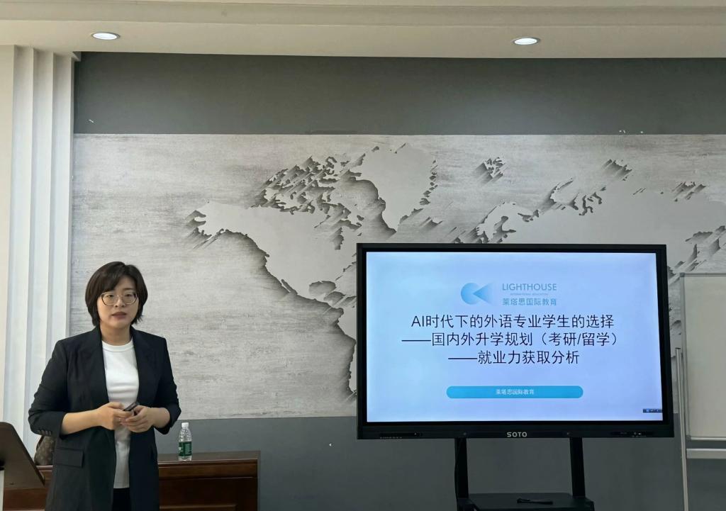 讲座开始,刁彤女士先是对自己的求学生涯进行了细致回顾,回忆其创业历程,并由此提出“AI时代下的外语专业学生的选择——国内外升学规划(考研/留学)——就业力获取分析”这一极具现实意义的研究问题。