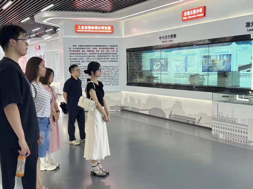在走访过程中,曲镜达老师一行受到了东方测控集团有限公司的热情接待。在走访东方测控仪器仪表工业园区的过程中,负责人详细介绍了东方测控集团的智能装备、云技术服务平台等数字化设施,我院师生认真聆听,亲身体验到了东方测控浓厚的创新氛围,并深入感受了现代企业的运营模式及行业前沿动态。随后,英院师生参观了东方测控企业展示中心,学生们对于东方测控的快猫短视频、市场定位以及未来发展规划有了更进一步的认识,对企业的发展历程和行业地位有了更加直观的了解。